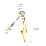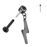 Discover the elegance of our Internally threaded implant-grade titanium labret adorned with Bezel Set Cubic Zirconia and a charming Lightening Dangle. Choose from a variety of stunning colors including Silver with clear Gem, Gold with clear Gem, Black with Vitrail Medium Gem, and Rose Gold with Aurora Borealis Gem. This versatile piece is perfect for various piercings including labret, cartilage, ear, nose, and lip.